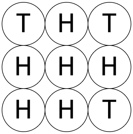 N2개의 동전이 N행 N열을 이루어 탁자 위에 놓여 있다. 그 중 일부는 앞면(H)이 위를 향하도록 놓여 있고, 나머지는 뒷면(T)이 위를 향하도록 놓여 있다. <그림 1>은 N이 3일 때의 예이다.