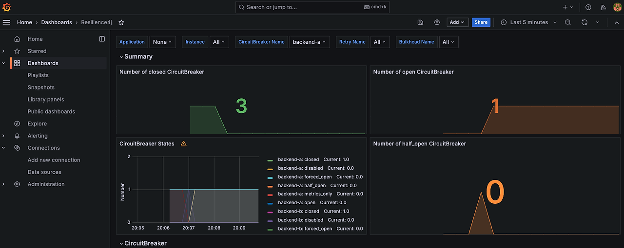 - 서킷브레이커 1개가 OpenAPI 장애로 Open 돼있고 3개가 Close 돼있는 것을 볼 수 있다.