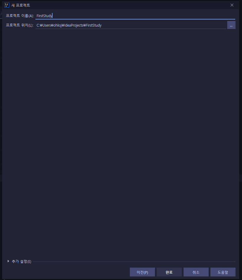 여기서는 프로젝트 이름을 자신이 원하는 대로 입력해주세요! (상관 없습니다.. 그냥 폴더(프로젝트) 이름이 이것으로 생성됩니다.)