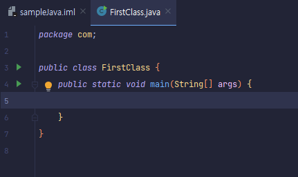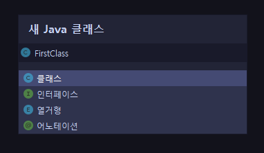 맨 위 클래스가 지정되어있는 것을 확인한 후에 클래스 이름을 짓습니다. 저는 FirstClass라고 지었습니다!