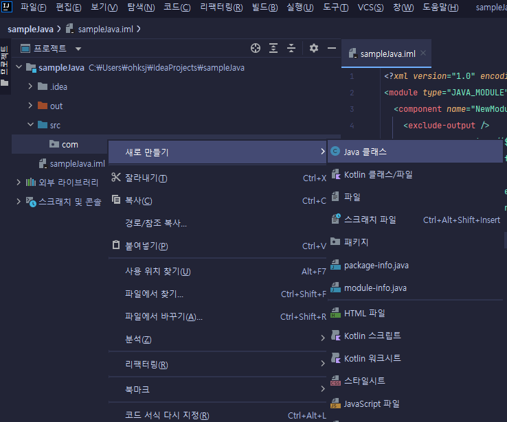 그 후 패키지(com)에 우클릭 하고 새로만들기 -> Java 클래스를 클릭하시고